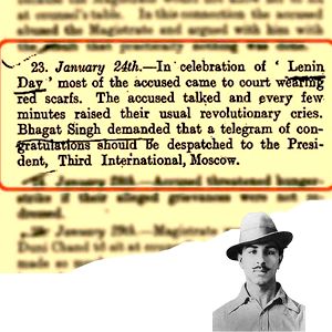 গীতা, গ্রন্থ সাহিব নয়। ফাঁসির ঠিক আগে তিনি পড়ছিলেন লেনিন। তবে কি ভগৎ সিংয়ের দেশপ্রেমে খামতি ছিল! ‘বধিরকে শোনাতে’ আজকের সংসদ, সেদিনের সেন্ট্রাল অ্যাসেম্বলিতে ভগৎ সিং আর বটুকেশ্বর দত্ত যখন নির্বিষ বোমা ছুড়েছিলেন, তখন একইসঙ্গে ছড়িয়েছিলেন প্রচারপত্র। আর সেই প্রচারপত্রে ছিল ‘ইনকিলাব জিন্দাবাদ’, ‘সাম্রাজ্যবাদ নিপাত যাক’ স্লোগান। বন্দে মাতরম্ থেকে ইনকিলাব জিন্দাবাদ। তাহলে কি দক্ষিণ এশিয়ার ‘চে গুয়েভারা’ দেশপ্রেমিক ছিলেন না! অন্যদিকে, লেনিন। জুলাই, ১৯০৮। ‘দেশদ্রোহের’ অভিযোগে তিলকের ছয় বছর কারাবাসের সাজা ঘোষণা। ইতিহাসবিদ বিপান চন্দ লিখছেন, প্রতিবাদে সমস্ত সুতাকল ও রেলশ্রমিকদের সর্বাত্মক ধর্মঘটে স্তব্ধ বোম্বাই। নামানো হয় সেনা। রাস্তায় শহীদ হন ১৬ জন শ্রমিক। জখম আরও ৫০ জন। ভারতে শ্রমিকদের ধর্মঘট দেখে ইনফ্লেবেল ম্যাটেরিয়াল ইন ওয়ার্ল্ড পলিটিক্স নিবন্ধে ভ্লাদিমির লেনিন লিখছেন, ‘ইতিমধ্যে ভারতেও সর্বহারা জনগণ সচেতন রাজনৈতিক গণসংগ্রাম গড়ে তুলছেন। এবং তার ফলে ভারতে রুশ ধাঁচের ব্রিটিশ শাসন ব্যবস্থার হালও শোচনীয় হয়েছে।’